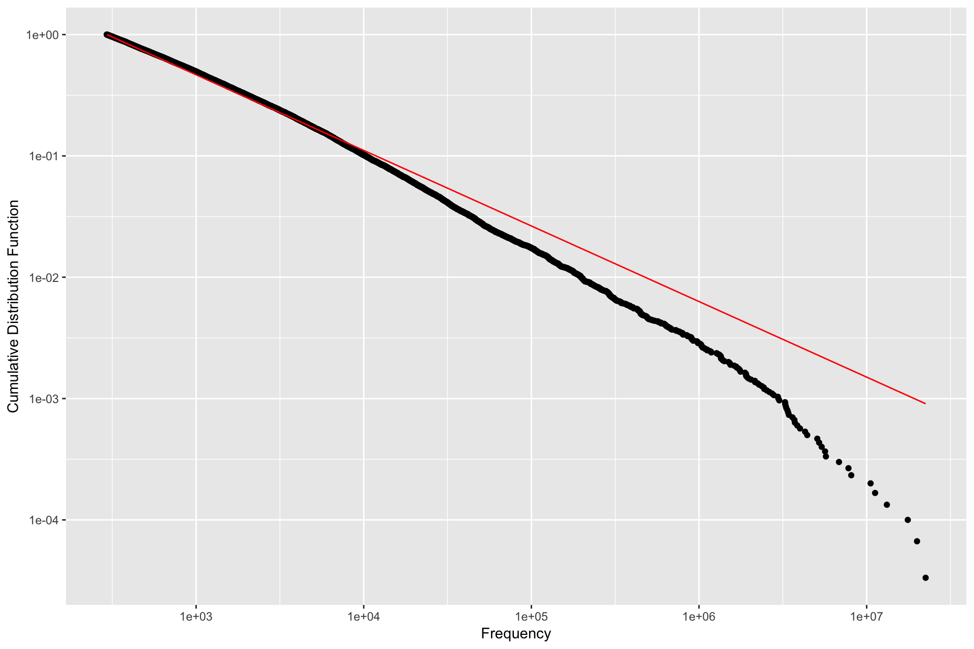 We can test if a discrete power law (Zipf) fits the data well (for English). The red line shows the fitted power law with α= 1.6